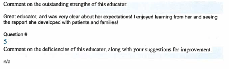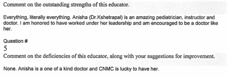 Thankfully, Children’s National had a great culture of feedback, and when I became a senior resident, I tried hard to elicit honest feedback each week (so that it was timely). They also rated senior residents in a formal way, and I was able to obtain that feedback later.