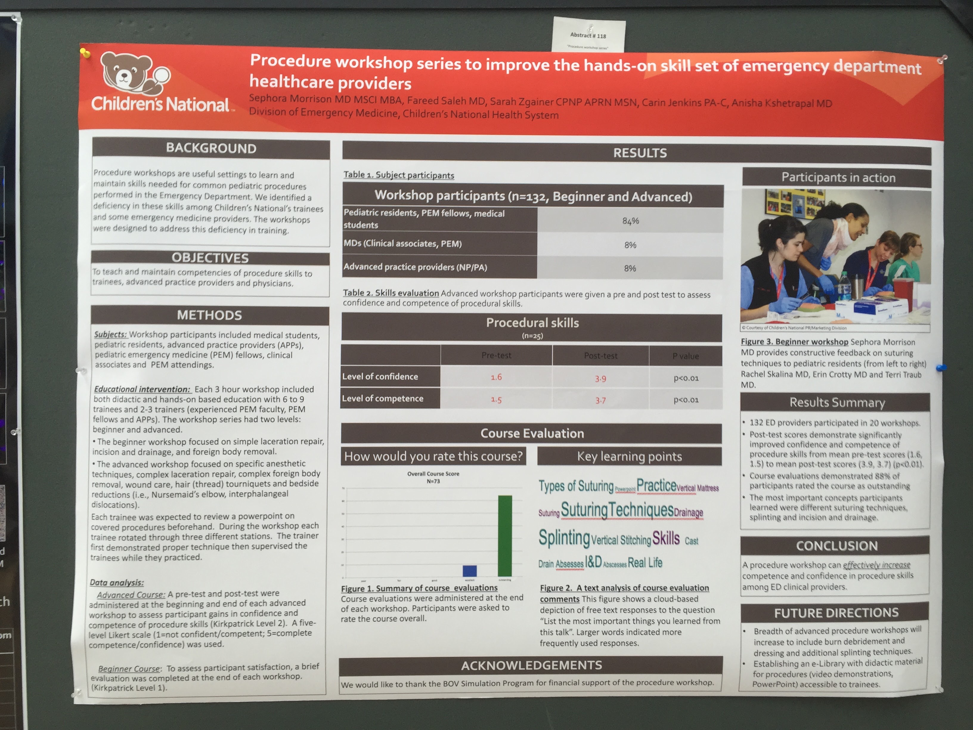 While in residency, I collaborated with team of emergency medicine clinicians at Children’s National to develop a resident workshop in minor procedural skills. We delivered this workshop twice at the American Academy of Pediatrics NCE meeting and have enjoyed teaching pediatricians the basics of these procedures.