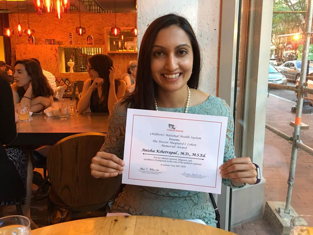 I received this award upon graduating residency. It is awarded each year to a single resident who has shown exceptional interest, diligence, and excellence of judgment in the care of pediatric patients.